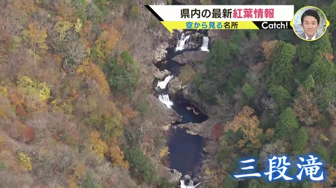 三段峡上空へとやってきました。紅葉は今まさに見ごろを迎えているということなんですが、全体的にこちらも全体的に黄みがかっている様子がうかがえます。全長およそ16km、国の特別名勝にもなっている峡谷、三段峡です。こちらは三段滝です。南の正面口から北へと進んできましたが、奥へと進むにつれ、色づきが濃くなっているのが見てとれます。鮮やかな黄色やオレンジが増えてきました。