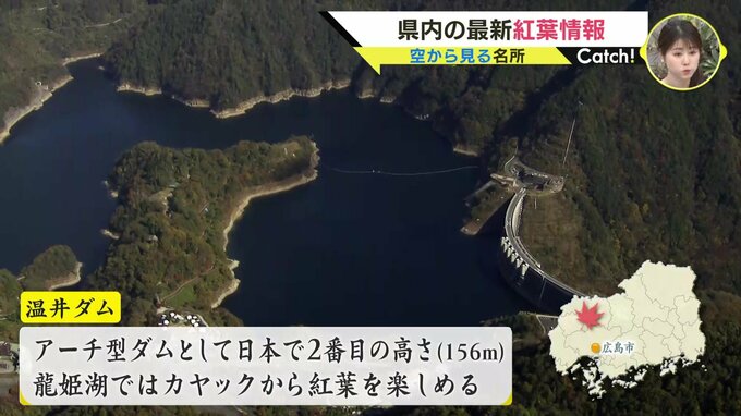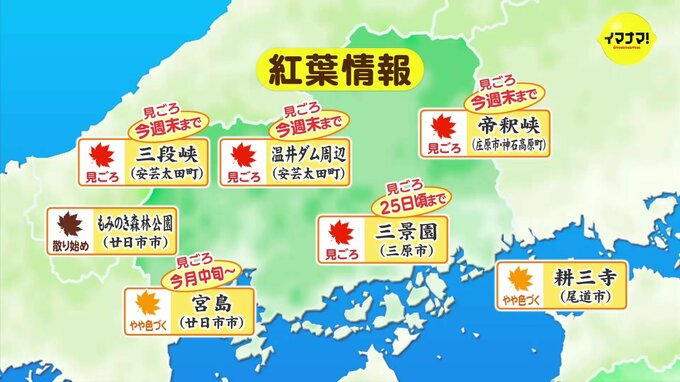 広島県内の紅葉の名所です。地元の観光協会や観光施設に聞いたところ、帝釈峡・温井ダム・三段峡など県北部は今が見ごろというところも多く中には散り始めというところもあります。見ごろは今週末までといったところでしょうか。一方、宮島は色づき始めています。県南部は今月中旬から月末にかけて見ごろを迎えるのではないかということです。