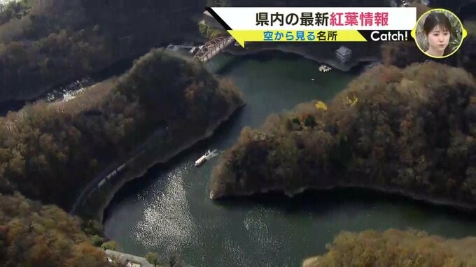 「神龍湖」は紅葉を楽しむ名所となっていまして、水面に映る色が美しく、人気の紅葉スポットです。きょうも遊覧船が走る様子が見てとれますが、水面から見る紅葉も絶景でしょうね。