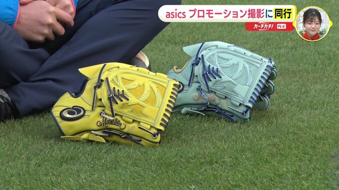 さて、先日、森下投手がある撮影に臨んでいたので、その様子を取材しました。森下投手が使っているASICS(アシックス)のプロモーション撮影です。グッズを使っている選手の中でも “広告塔” と呼ばれる方が担当するわけです。ふだん見慣れない青い服、そしてグローブが2種類。これを来シーズンは使うかもしれない?