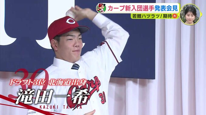 左ピッチャー、北海道から来た 滝田一希 投手は、ドラフト3位。会見では、会場が笑い声に包まれました。