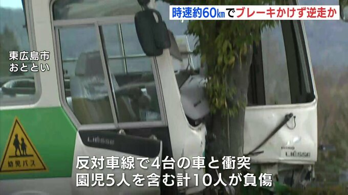 この事故は東広島市の市道で18日に発生。認定こども園の送迎バスが中央分離帯を乗り越え、およそ100メートル逆走。反対車線で4台の車と衝突し、園児5人を含むあわせて10人がけがをしました。