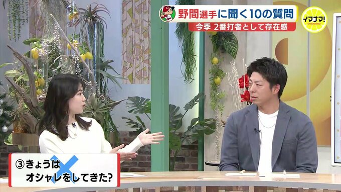 4番・野間峻祥も見てみたいです。意外だったのが、「きょうはオシャレをしてきた?」答えは×でしたけど?