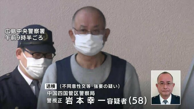 「ぼく警察官なんよ」20代女性に性的暴行の疑い 警視正の男(58)を送検 2024年1月11日(木) 12:21 国内 広島市で、警察官であることを伝えたうえで20代の女性に性的暴行を加えたとして、警視正の男が送検されました。警察は他にも余罪があると見て捜査を続けています。不同意性交等と強要の疑いで送検されたのは、中国…