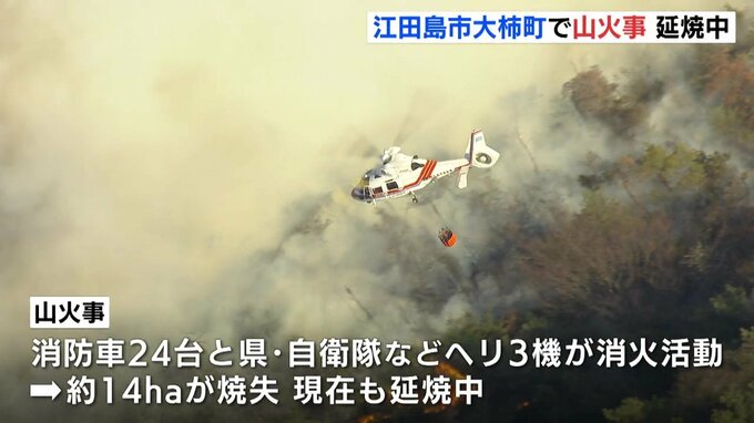 消防車24台と県や自衛隊などのヘリ3機が出動して消火にあたっていますが、約14ヘクタールを焼き、現在も延焼中だということです。