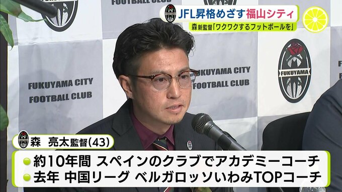 2年続けてJFL昇格を逃している福山シティFC。今シーズン、指揮を執るのは、スペインで10年間の指導者経験を持つ43歳の 森亮太 監督です。