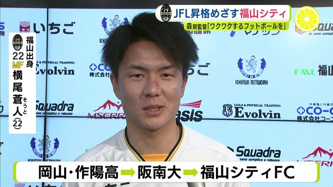 「阪南大学から移籍してきました 横尾蒼人 です。自分がこうやって入って、福山を盛り上げていって、それでプロのチームができたらなというのが1番の自分の目的です」