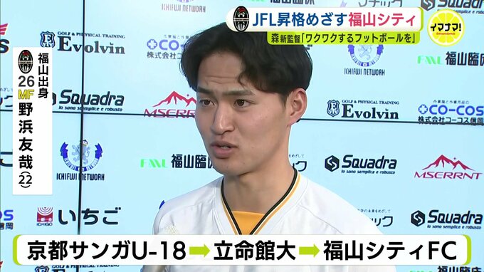 「立命館大学から加入することになりました背番号26番・野浜友哉 です。素直にうれしいですね。福山のために戦えることに誇りを感じています」
