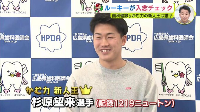 “かむ力” で栄えある新人王に輝いたのは、育成3位の 杉原望来 選手。その力は、なんと1219ニュートン。一般成人男性のおよそ2倍の力だそうです。