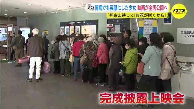 全国上映よりも一足早く福山市で開かれた完成披露上映会。開場前から長い列ができました。翔華さんの短くも多くの人の心に影響を与えた人生は、見に来た人たちにどう映ったのでしょうか。