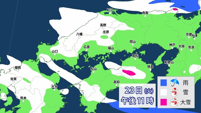 中国山地では長く降雪が続き日中も気温が低いため、積雪がかなり増えるおそれがあります。山陽南部の平地でも積雪となる所があるでしょう。