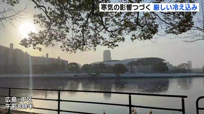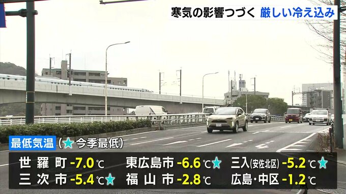 各地の最低気温は世羅町でマイナス7℃、東広島市でマイナス6・6℃、広島市中区でマイナス1・2℃など、県内に19ある観測点すべてで氷点下の厳しい冷え込みとなりました。6つの地点でこの冬、最も低い気温を観測しています。