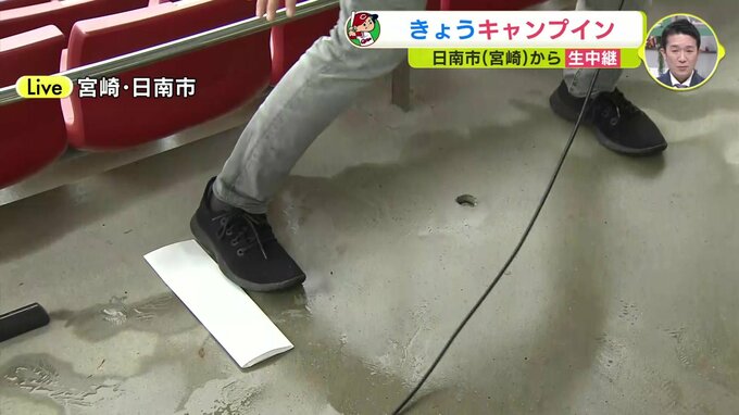 大瀬良投手と斉藤投手は、自主トレを一緒にやっていたわけなんですが、斎藤投手は、大瀬良投手にアドバイスを受けたそうです。足元をご確認いただけますか。RCCスタッフの技術が結集された特設のピッチャープレートをご用意しました。画用紙3つ折りです。