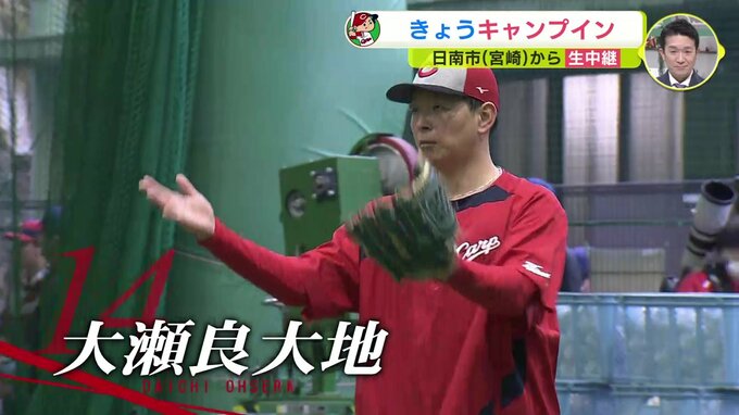 キャッチボール相手が、大瀬良大地 投手です。手術明けのキャンプということで、キャッチボール以降は別メニュー調整になったんですが、もうブルペンに入れるぐらいの高い出力でボールを投げることができているということでした。このキャンプ中にブルペンに入るという話をしていました。ここから状態を上げて、開幕ローテーション、さらには開幕投手争いに臨むのかどうかというところは、さらに注目していきたいというふうに思います。