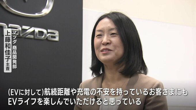 マツダ上藤和佳子主査「(EVに対して)航続距離とか、充電に関する不安を持っていらっしゃるお客様、こういうお客様にも安心してこの車、あのEVライフを楽しんでいただきそういうお客様に楽しんでいただけるというふうに思っています」