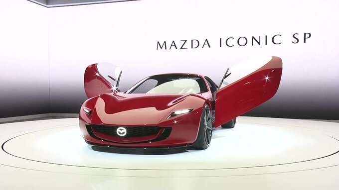 2023年10月 ジャパンモビリティショー 小林キャスター「こちら がICONICSPです。カラーはビオラレッド。この中には2ローターのロータリーが発電機として載ることになっています」
