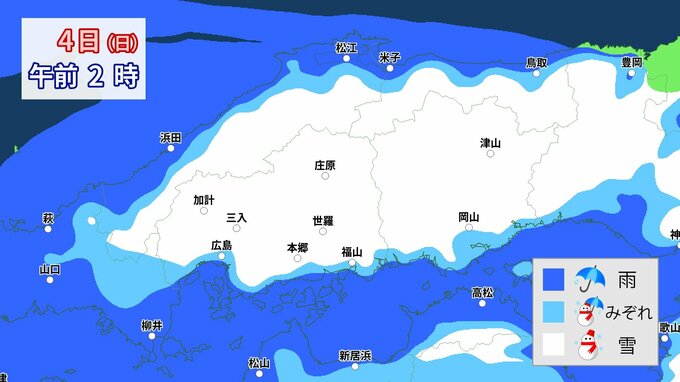 世羅や広島空港といった東部の内陸でも気温の下がり方次第では雪化粧する可能性があります。