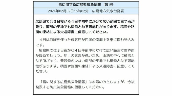 2日午後、広島地方気象台は広島県に「雪に関する情報」を発表しました。