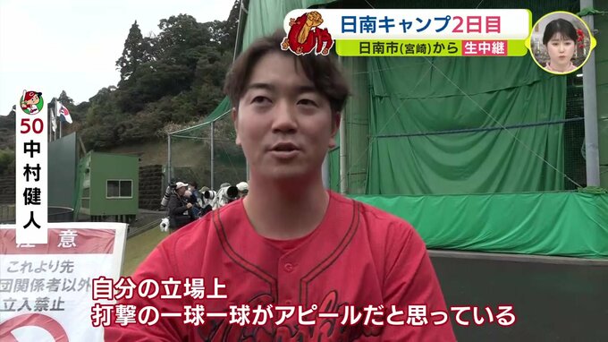 「2か月間取り組んで、このキャンプで何かよくしようというよりは、本当に自分の立場上、バッティングの1球1球がアピールだなと思って入っていますし、この(オフの)2か月で仕上げて、(キャンプの)2月、エンジンかかりきりで行くんだと思って入ったので、いい形で自分の体になじんでいるんじゃないかなとは思います。キャンプとオープン戦という区切りがありますけど、ぼくにはないと思ってるので、ピッチャーの方がバッティング練習で投げてくれる1球とか、紅白戦とか、全部こう、がっついていきたいなと思います」