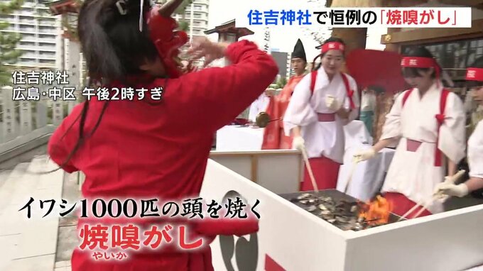 住吉神社で恒例の「焼嗅がし」 「感染症の疫病神」など退治 「頂き女子」も 2024年2月3日(土) 18:06 国内 広島市の神社で節分にちなんで人騒がせな厄介者を退治する、ユニークな行事が行われました。広島市中区の住吉神社で行われたのは、イワシ1000匹の頭を焼く「焼嗅がし」です。平安時代の節分行事だということで、イ…