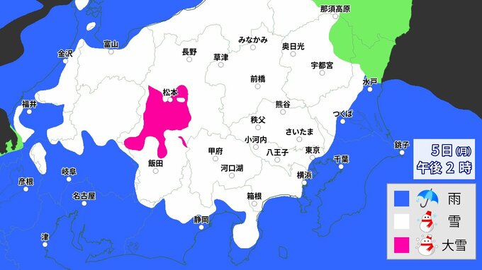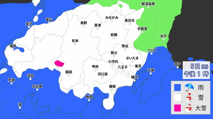 【大雪情報】東京23区も積雪か 月曜午後から関東甲信で大雪予想 1時間ごとの降雪予想 山地最大40cm大雪警戒 平地も広く積雪か 南岸低気圧が発達しながら東進 2024年2月4日(日) 17:57 国内 5日(月)午後 予想降雪シミュレーション