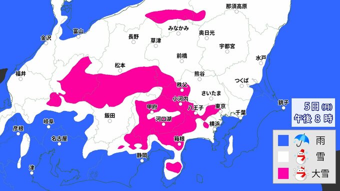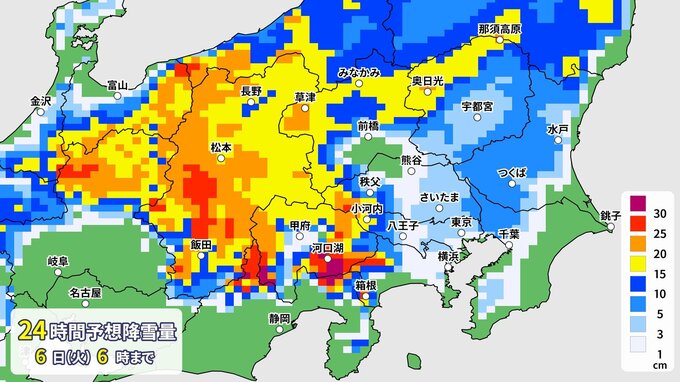 関東甲信地方では、5日昼過ぎから6日午前中にかけて山沿いや山地を中心に大雪となる所がある見込みです。予想より気温が低くなった場合には、平地でも警報級の大雪となる可能性があります。積雪や路面の凍結による交通障害に警戒・注意してください。また、ビニールハウスなどの倒壊、架線や電線、樹木への着雪に注意してください。なだれにも注意してください。
