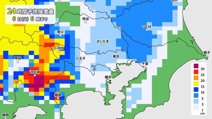 埼玉県では、5日夕方から6日午前中にかけて、秩父地方などの標高の高い所を中心に、南部・北部でも大雪となる所があるでしょう。平地でも積雪となる所があり、予想より気温が低くなった場合には、警報級の大雪となる可能性があります。積雪や路面の凍結による交通障害に注意・警戒し、架線や電線、樹木への着雪に注意してください。