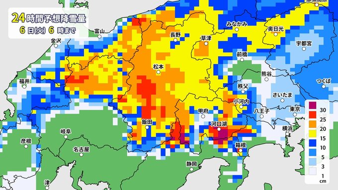 山梨県では、5日昼前から6日午前中にかけて雪が降り、大雪となる所があるでしょう。予想より気温が低くなり降雪が強まった場合には、警報級の大雪となる可能性があります。積雪や路面の凍結による交通障害に注意・警戒し、架線や電線、樹木への着雪に注意してください。また、ビニールハウス等の農業施設は倒壊のおそれがあるため注意が必要です。
