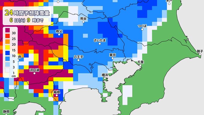 埼玉県では、5日夕方から6日午前中にかけて、秩父地方などの標高の高い所を中心に、南部・北部でも大雪となる所があるでしょう。平地でも積雪となる所があり、予想より気温が低くなった場合には、警報級の大雪となる可能性があります。積雪や路面の凍結による交通障害に注意・警戒し、架線や電線、樹木への着雪に注意してください。