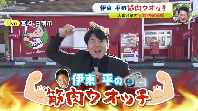 5日、広島カープの日南キャンプは休日。ルーキーたちは、ウナギのつかみ取りを体験したんですが、やっぱりウナギは滑りました。わたしは滑りたくないです。先週の金曜日のわたしの肝いり企画をご紹介したのを覚えていますか? 5日は練習がないからあのコーナーはないんじゃないかというふうに思ったんじゃないですか? この週末にわたくし、“筋肉を撮りためる” 、すなわち “貯筋” してまいりました。行きましょう。きょうの「伊東平の筋肉ウォッチ」―。