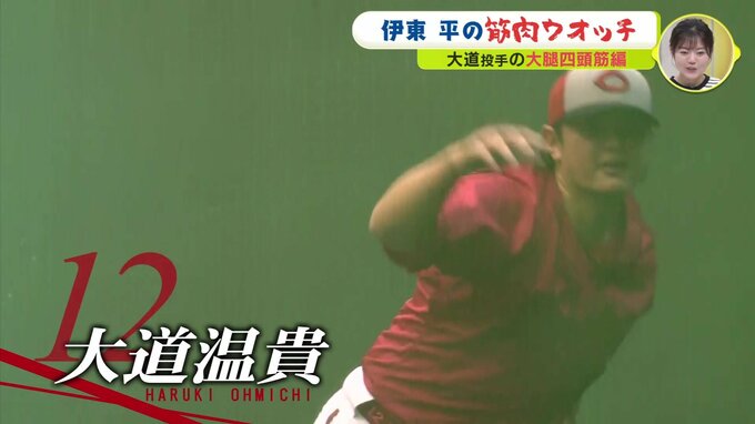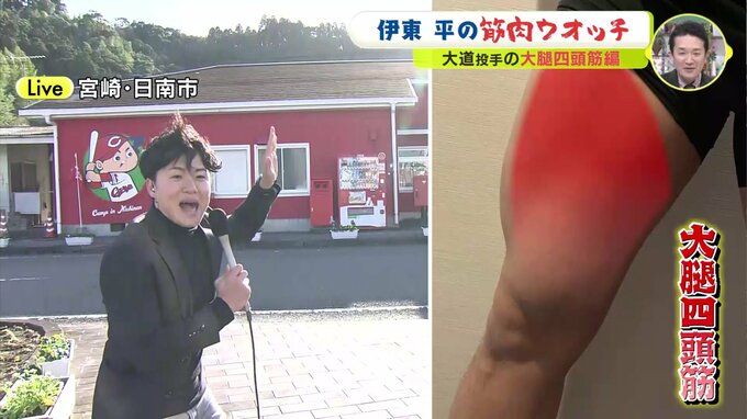 入手したんです。見てください。大腿四頭筋の外側広筋のふくらみが、きょう見たマグロみたいなんです。内側広筋もすごいんです。裏側のハムストリングも本当に自信を持っているということで、この下半身から繰り出されるストレート、今シーズン、楽しみにしてほしいというふうに思います。