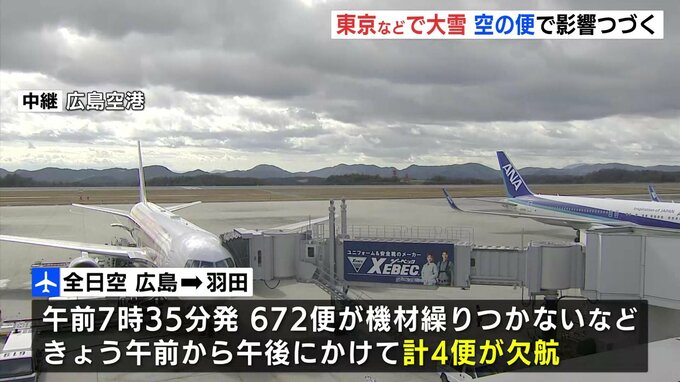 全日空によりますと、広島発羽田行きは午前7時35分発の672便が機材繰りがつかず欠航するなど、午前から午後にかけてあわせて4便が欠航しています。