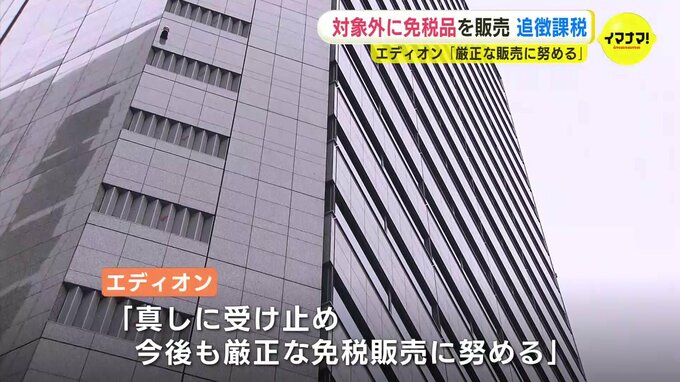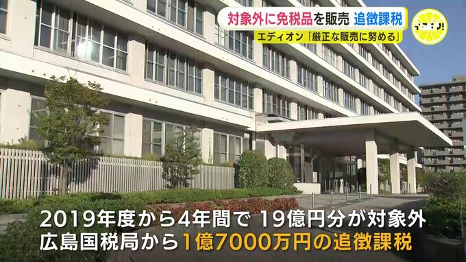 広島国税局の調査で判明しました。2019年度からの4年間で免税品売り上げのうち19億円が免税対象外で、去年1月広島国税局からおよそ1億7000万円を追徴課税され、エディオンは修正申告して全額納付したということです。