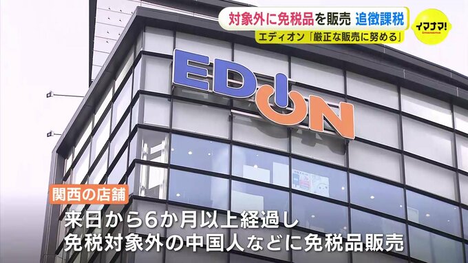 エディオンによりますと、関西にある複数の店舗で来日から6か月以上が経ち免税の対象とならない中国人などに免税品を販売していたということです。