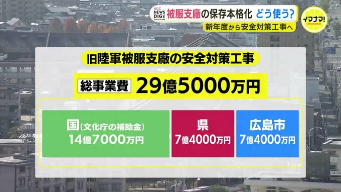 RCCの取材では、県が所有する3棟の安全対策工事の総事業費は、29億5000万円です。このうち半分の14億7000万円は、被服支廠が重要文化財に指定されたことによって、文化庁の補助金が充てられる見込みです。残り半分の14億8000万円は、県と広島市が折半することになっています。