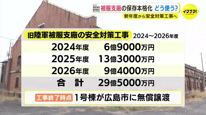 被服支廠の安全対策工事は、2024年度から26年度まで3か年度かけて実施される予定です。そして、工事終了時点で3棟あるうちの1棟=最も北側にある1号棟が、広島市に無償譲渡される予定になっています。