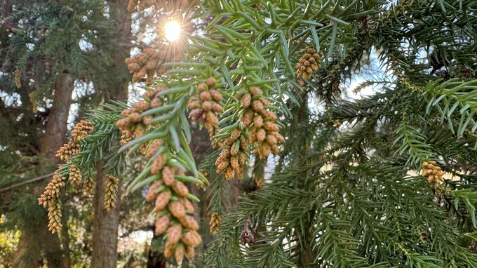 すでに西日本や東日本では微量ながら花粉は飛び始めた所も多くなっていますが、山沿いのスギ林を見に行くと、大量の花粉が入っているであろうスギの雄花が、「いつでも飛ぶ準備はOK!」といった様子でぶらさがっている様子が確認できました。