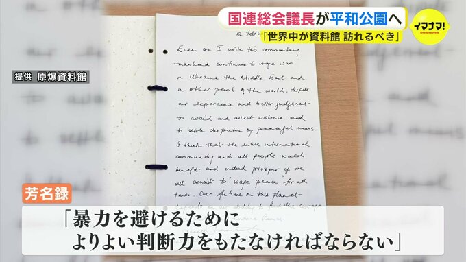 芳名録には「この芳名録に記帳している間も、世界では戦争が起こっている。暴力を避けるために、私たちはよりよい判断力をもたなければならない」と記帳しました。