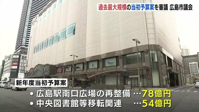 駅ビルの開業を控えた広島駅南口広場の再整備に78億円。広島市立中央図書館などの移転のため商業施設エールエールA館の不動産取得や整備に54億円をあてています。