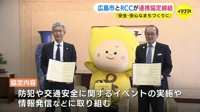 締結式ではイマナマのキャラクター「レモンチ」も立ち会い、広島市の松井一実市長とRCCの宮迫良己社長が協定書に署名しました。
