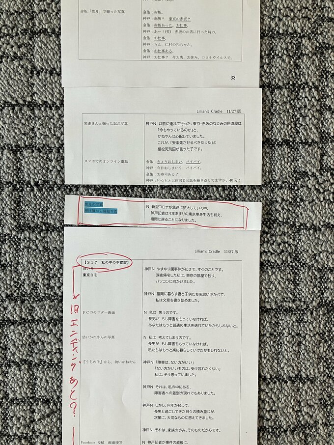 僕はパソコンの画面だけで台本を確認することが苦手なんです。何ページにもなってくると、画面にはちょっとしか出ないじゃないですか。紙にプリントすると、何となく「ここの比重がすごく大きいな」とか、「ここが短すぎるんじゃないかな」「出てくるのが早すぎるんじゃないか」とかが、一覧で分かるんです。80分の映画版だと台本は50ページぐらいあったんですけど、廊下に1列ずらっと並べて、半腰になって見ていきました。