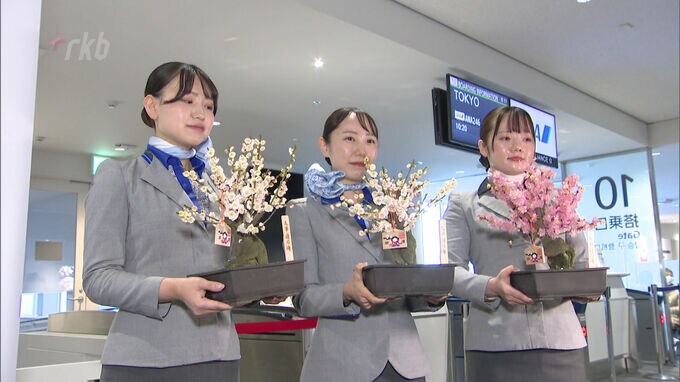 26日午前8時から福岡空港で行われた梅の使節の出発式では神職がお祓いをしたあと、全日空の客室乗務員やグランドスタッフに3つの梅鉢が手渡されました。「梅の使節」は、太宰府天満宮で育てた梅の花を、東京に送って、一足早い春を届けようと、行われているもので、今回で42回目となります。