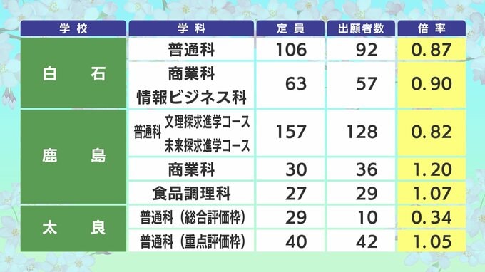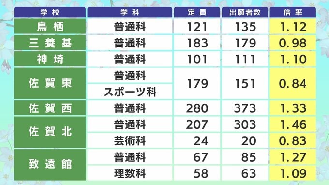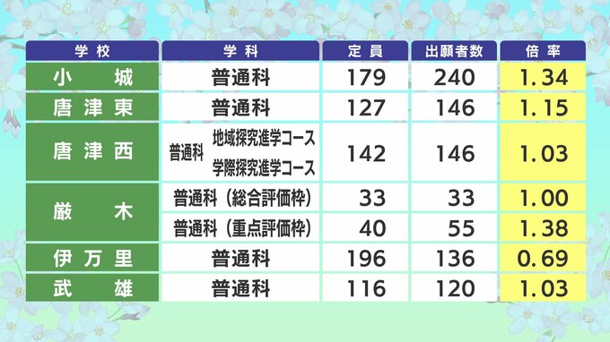 佐賀県公立高校入試2024出願倍率 佐賀北高校1.46倍、厳木高校が1.38倍 全校全学科出願倍率一覧【2月28日発表】 2024年2月28日(水) 19:29 国内 【気になる志望校の倍率は?】 ◆鳥栖、三養基、神埼、佐賀東、佐賀西、佐賀北、致遠館 ◆小城、唐津東、唐津西、厳木、伊万里、武雄 ◆白石、鹿島、太良