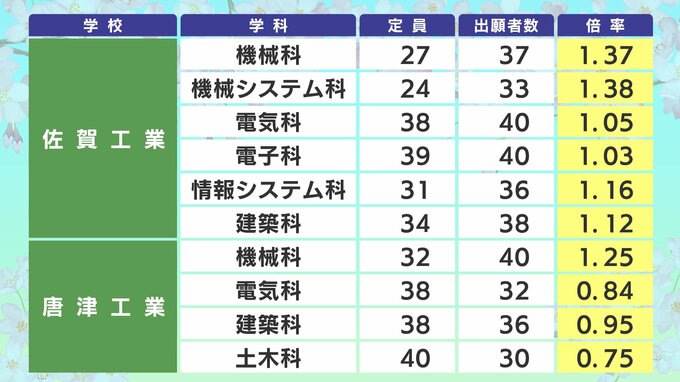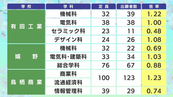佐賀県公立高校入試2024出願倍率 佐賀北高校1.46倍、厳木高校が1.38倍 全校全学科出願倍率一覧【2月28日発表】 2024年2月28日(水) 19:29 国内 ◆ 佐賀工業、 唐津工業 ◆ 有田工業、 嬉野、 鳥栖商業 ◆ 佐賀商業、 唐津商業、 神埼清明、 多久、 唐津青翔