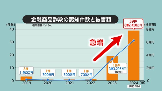 株や証券などに関するうその情報を伝え、利益が得られると誤信させて金をだまし取る「金融商品詐欺」。福岡県内では、去年19件と被害が急増し、被害の総額は3億3000万に上りました。今年は、今月25日時点で39件と去年を大幅に上回るペースで被害が起きていて、被害の総額は、すでに6億円を超えています。
