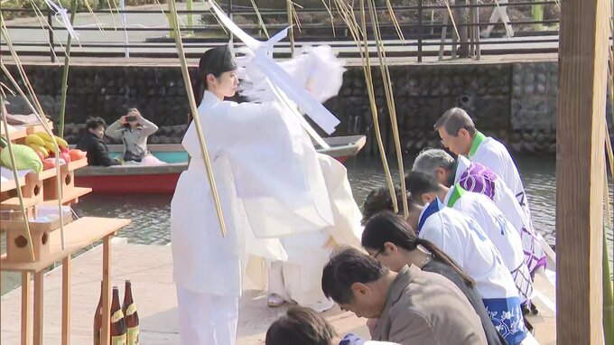 柳川市で開催された「お堀開き」には、川下りの事業者や観光協会の関係者などの30人あまりが参加しました。1年間の川下りの安全を祈願する「お堀開き」は、「どんこ舟」に乗った神職と関係者たちが「堀割」を清めていくものです。