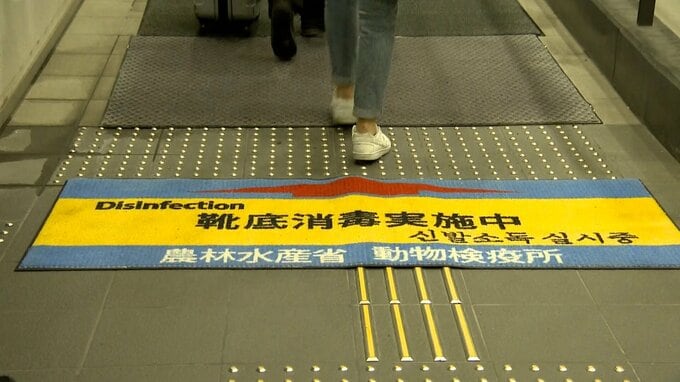 釜山との就航便もある海の玄関口・博多港の国際線ターミナルでは、通路に消毒薬をしみこませたマットを設置しています。動物検疫所によりますと、アフリカ豚熱のウイルスは、靴底に付着した状態で国内に侵入する可能性があるからです。