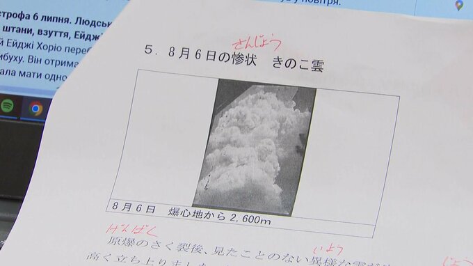 ウクライナのゼレンスキー大統領が原爆資料館にウクライナ語の音声ガイドがないことを知り、大使館が学生たちに翻訳を依頼。半年ほど前から、被爆者の遺品や写真などに関する説明の翻訳に取り組んできました。「きのこ雲」など初めて目にする言葉に苦戦しながらも、被爆者の話を聞きながら1つ1つの言葉を丁寧に翻訳してきた3人。侵攻から2年が過ぎても終わりの見えない戦闘が続く母国のいまと広島の惨状が重なったと話します。