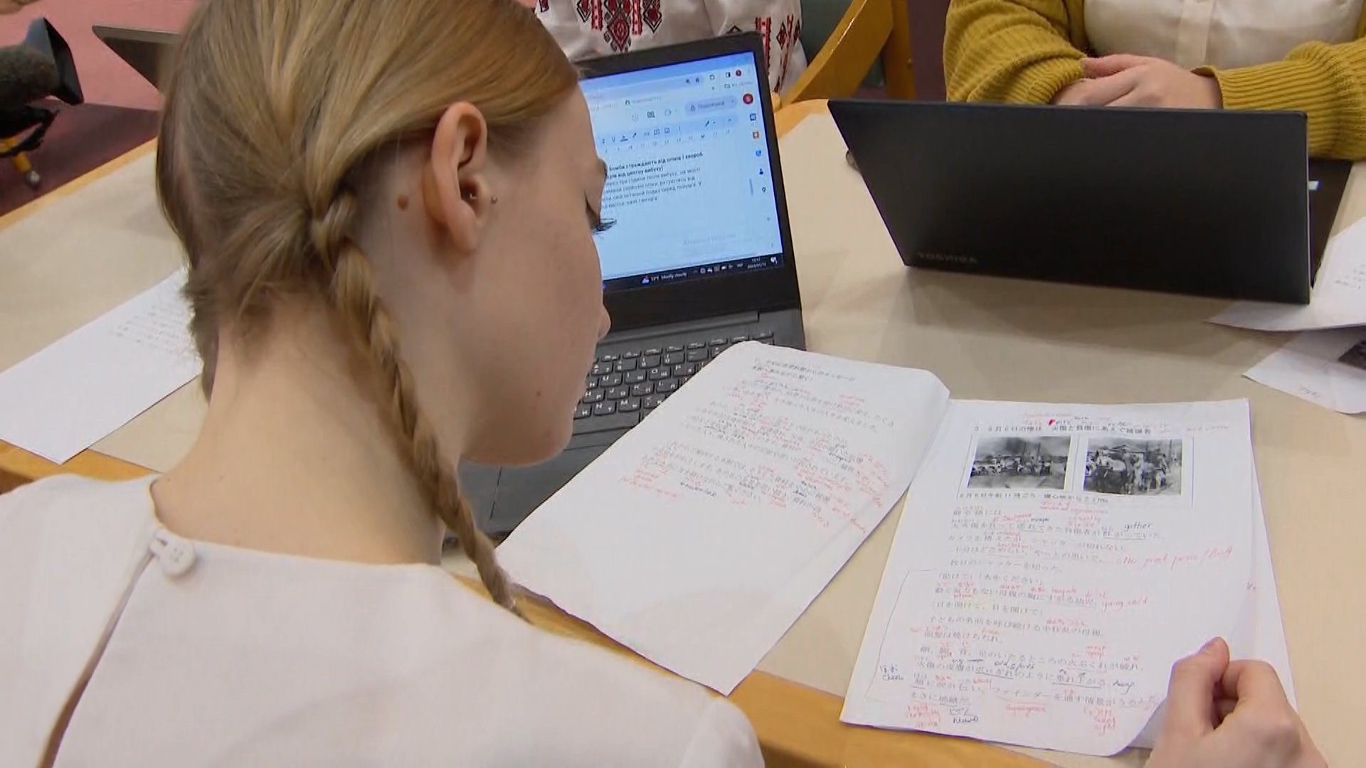 ウクライナのゼレンスキー大統領が原爆資料館にウクライナ語の音声ガイドがないことを知り、大使館が学生たちに翻訳を依頼。半年ほど前から、被爆者の遺品や写真などに関する説明の翻訳に取り組んできました。「きのこ雲」など初めて目にする言葉に苦戦しながらも、被爆者の話を聞きながら1つ1つの言葉を丁寧に翻訳してきた3人。侵攻から2年が過ぎても終わりの見えない戦闘が続く母国のいまと広島の惨状が重なったと話します。