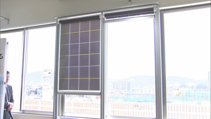 宗像市の城山中学校では29日、ロールカーテン状の太陽光発電機が校舎の窓際に設置されました。住宅設備メーカー大手のLIXILが開発したもので、遮光性や断熱性が高く、冷暖房の効率を上げる省エネ効果もあるほか、外を見る時には巻き上げることができます。